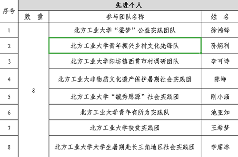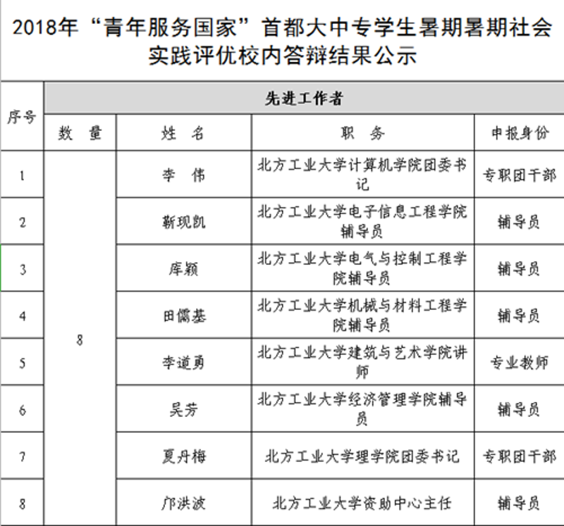 2018年暑期校团委组织开展了以“青年服务国家”为主题的大学生暑期社会实践活动。通过多种形式组织动员在校学生立足首都,面向全国,积极开展形式多样、主题鲜明、特色突出的暑期社会实践活动,充分发挥了社会实践作为加强和改进大学生思想政治教育重要途径的优势,取得了良好效果。为选树典型、表彰先进、推广经验,校团委组织开展了暑期社会实践的总结评审工作,经专家评审,我校有8支团队、8位教师、8名同学脱颖而出,获评推荐“2018年首都大中专学生暑期社会实践优秀团队、先进工作者、先进个人”的资格,现将名单公布如下。