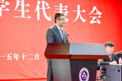 郭玉良副书记代表学校党委发表讲话。他向学代会的召开表示祝贺,对学生会两年来为学校和学生所做的贡献表示感谢,对校外的来宾表示欢迎。他对参会的学生代表和学生会干部提出了三点希望:一是要增强服务同学的动力。把握好学生与学生干部的关系,学生干部应敢于面对困难、善于解决难题,只为成功创条件,不为失败找借口;把握好学生干部与学生会的关系,学生会要围绕共同的奋斗目标,把学生干部调动起来,发挥整体的合力、集体的动力;把握好组织使命与时代使命的关系,学生骨干要走在时代的前列,把个人的发展与祖国的发展结合起来。二是要提高服务同学的能力。用可能达到的最高标准来要求学生会的工作。首先要讲原理,把学风建设作为各项工作的核心;其次要对问题进行共同识别和解决,对目前学生会服务同学中存在的问题深入研究;再次要改善思维方式,提高敏感度和辨别力。三是要不断焕发服务同学的魅力。学生干部不仅要多才多艺,还要敢于奉献、敢于担当。首先要发扬匠人精神,认真做好每一件事情,做到精益求精;其次要发扬铁人精神,勇于坚持、培养耐心、超越自我;再次要发扬悦人精神,以干事业的心态为同学们提供热情的服务。