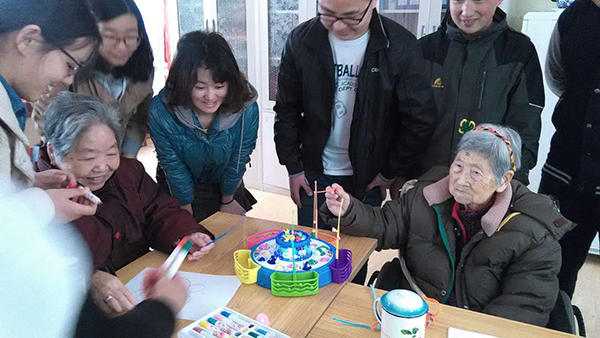 电气与控制工程学院团总支于3月5日上午组织学生志愿者到石景山区乐龄老年社会工作服务中心开展“助老护老”志愿服务活动。 志愿者两两分组与老人们亲切交流,进行绘画、折纸等益智小游戏。志愿者还精心准备了唱歌、朗诵及跳舞等丰富多彩的节目,丰富了老人们的日常生活,得到了老人们的阵阵掌声。在击鼓传花环节,一位老人需要与志愿者进行绘画互动。老人的年龄已高,听力水平退化,但在活动中一直表达着对志愿者的感谢,并希望志愿者好好学习,多来看望她。活动以全体志愿者诗朗诵《沁园春·雪》结束。