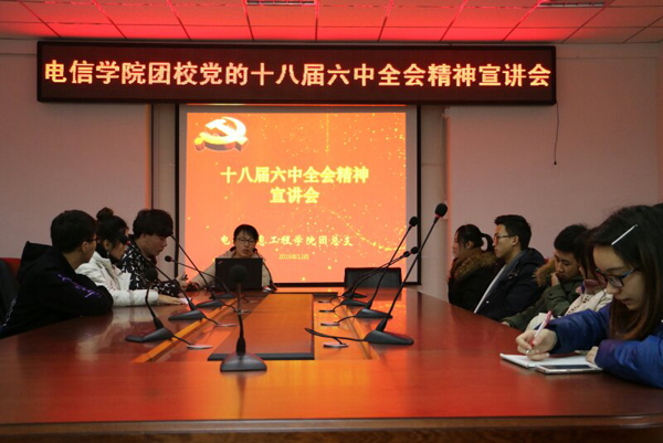 12月20日下午,电子信息工程学院团总支在博远楼1023会议室举办团校,开展党的十八届六中全会精神宣讲活动。学院团总支、学生会全体干部40余人参加了学习。