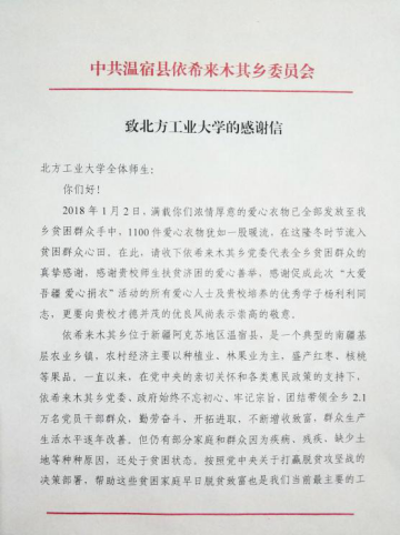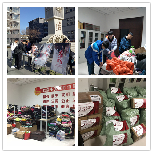 2017年12月底,校团委在全校范围内组织开展了“大爱吾疆”爱心捐衣活动,捐赠对象为新疆温宿县依希来木其乡贫困居民。此活动受到了我校师生的大力支持,活动结束后依希来木其乡党委专门寄来感谢信表示感谢,活动也被中闻文化网等媒体宣传报道,取得了良好的社会效应。