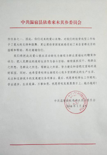2017年12月15日,2017届赴新疆温宿县依希来木其乡工作的援疆学生杨利利将一封家书寄回母校,希望母校能伸出援助之手,给依希来木其乡贫困居民送去温暖,帮助他们度过寒冬。收到杨利利同学的家书后,学校迅速响应,在校团委的统一部署下,借助文法学院法学本科学生第三党支部和国旗班学生的力量,在全校范围内组织开展了名为“大爱吾疆”的冬衣捐赠活动。通过微信、海报等方式对活动进行了宣传,并且设立捐赠热线为师生提供咨询及预约捐赠等服务。