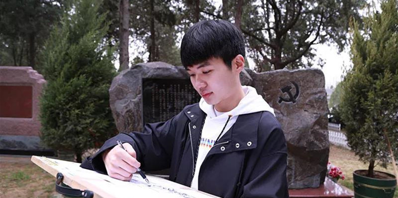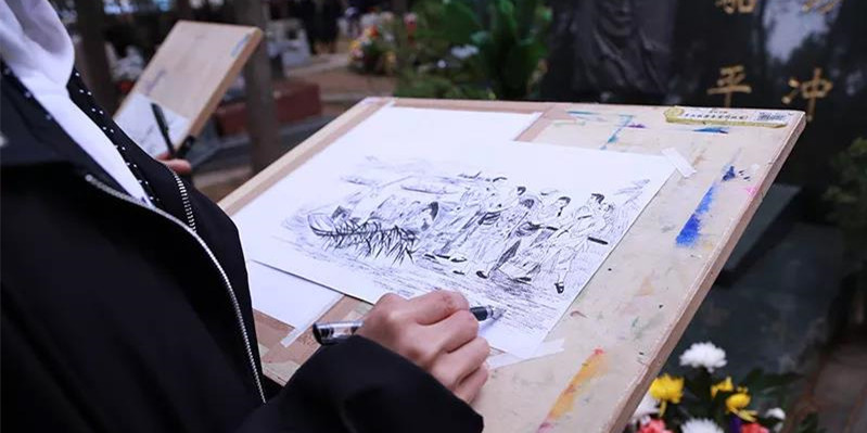 同学们用画笔现场描绘先辈们波澜壮阔的革命场景。