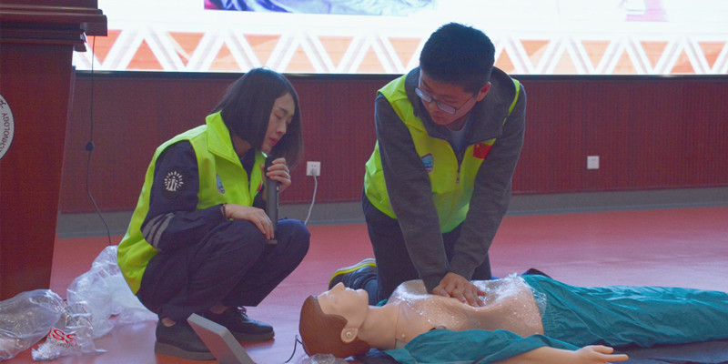 本次培训首先围绕民防的基本知识和火灾、地震的应急方式等内容展开讲解。志愿者代表为同学们讲解了包扎、心肺复苏及简易担架制作等项目的实践方法,并提供了实践材料让大家进行实际操作。通过集中培训并逐个上台实践,同学们已能够基本掌握简单的应急救援方法。