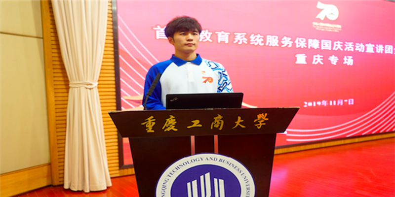 宣讲团成员辅导员库颖,群众游行学生代表蒋云飞、江泠睿,联欢活动学生代表张震、祖力哈亚提·艾力,国庆志愿者学生代表付潼,后勤保障组学生代表邱佳汇,向与会师生分享了服务保障国庆活动的精彩过程,生动的故事、动情的讲述,引发了重庆师生的强烈共鸣。