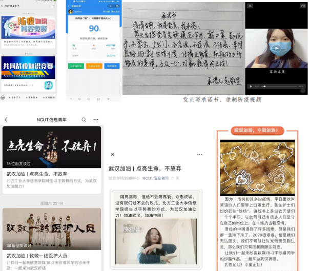 学院利用“NCUT信息青年”微信平台,开展“共同战‘疫’”网络防疫知识竞赛,提升学生科学防疫意识,树立信心,共克时艰。竞赛选取学习强国及其他权威媒体的35道题目,涵盖防疫基本知识和相关政策等。学院在线上开展“武汉加油”系列活动,创作沙画作品、录制“点亮生命,不放弃”加油视频,带动广大学生坚定信心,传递防疫正能量。依托学院学生党建中心开展“疫情当前,我是党员,我承诺!”活动,号召广大党员和积极分子,提高政治站位,带头遵纪守法,维护学校良好秩序。