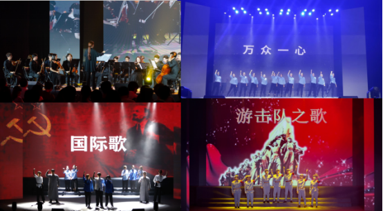 管弦乐《红旗颂》拉开了晚会的帷幕。乐曲时而激昂豪迈,时而舒展婉转,激起了观众爱党爱国的赤子心。舞蹈《觉醒》铿锵有力,将民族舞和现代舞充分融合,传递出革命先烈和志士仁人用生命唤醒了一个沉睡的旧中国的无畏气魄。歌曲联唱《国际歌》《游击队之歌》《我们走在大路上》澎湃激昂,催人奋进。