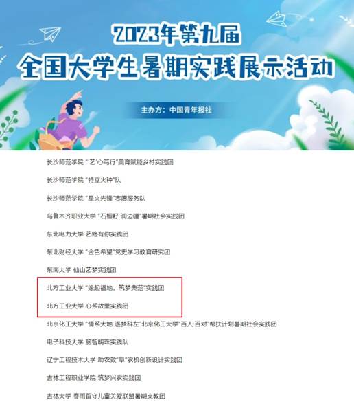 近日,由中国青年报开展的2023年第九届全国大学生暑期实践展示活动评选结果揭晓,我校信息学院“缘起福地·筑梦典范”实践团和文法学院“心系故里”实践团成功入选全国大学生暑期实践团队TOP100,这两支团队还获评了2023年“青年服务国家”首都大学生社会实践优秀团队。