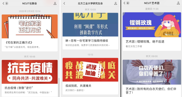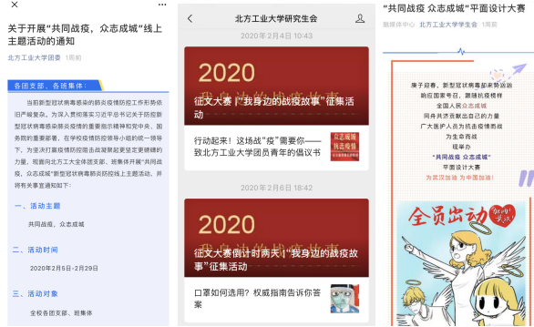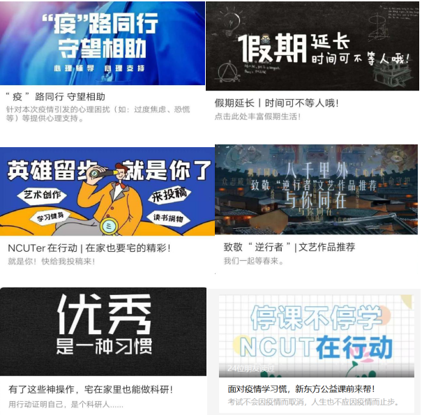 充分利用微信公众号、朋友圈、微博等新媒体平台,提供学习资源和策略,助力青年学生度过充实的假期。立足学生作息时间引导、心理波动疏导和个人成长需求发布《当“假期”再一次延长……》《NCUTer在行动 | 在家也要宅的精彩!》《假期延长丨时间可不等人哦!》《停课不停学,NCUT在行动》《致敬“逆行者”|文艺作品推荐》等多篇10余篇推文,运用幽默、诙谐的文字,借助视频、图片、海报等形式,为学生科学规划居家学习生活提供帮助。鼓励团支部、班级、宿舍等学生基层组织开展线上特色打卡活动,提醒青年学子在家防疫期间坚持规律作息。开展“共读一本书”线上读书分享、“尽一份孝心”孝老敬亲展示、“坚持一项体育运动”居家体育健身等活动,通过线上集体行动带动每位同学形成良好习惯,提高时间利用效率。