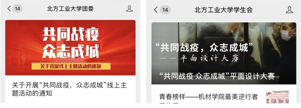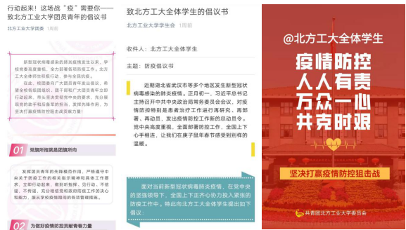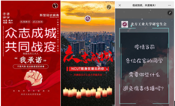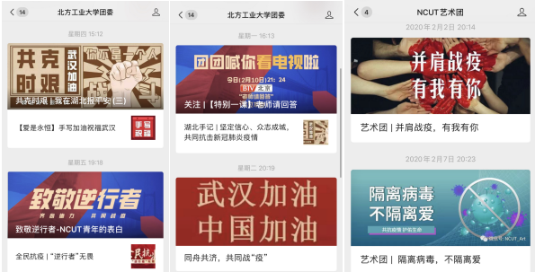 面对突发疫情,统筹安排团属新媒体,坚持正面发声,全方位、多角度,持续提供疫情防控信息。积极普及卫生防疫知识,占领疫情防控宣传主阵地,为疫情防控提供强大精神动力,为打赢疫情防控阻击战贡献新媒体青年的力量。校团委公众号开通“共克时艰|我在湖北报平安”专题,讲述身在湖北的同学抗疫故事,展示北方工大青年中的最美“逆行者”形象。团属微信公众号发布《【爱是永恒】手写加油祝福武汉》《“疫”路同行,守望相助》《同舟共济,共同战“疫”》《NCUT致身在湖北的你》等多篇新媒体作品,发动青年学生通过网络为武汉加油、为中国加油,展示并传递新时代青年在危难时刻的责任担当。