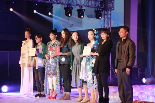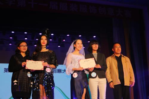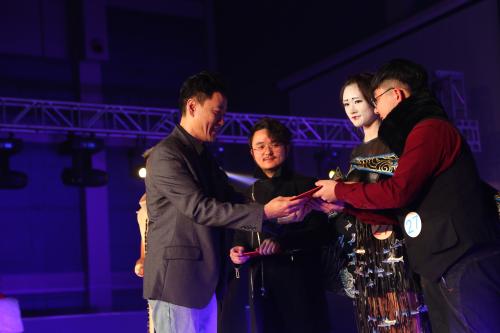 图为建筑与艺术学院老师张杞峰为服装视觉奖获得者颁奖