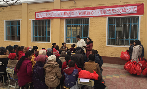土木工程学院学生志愿者来到新疆喀什叶城县依提木孔中学,带着北京团市委“温暖衣冬”活动以及该学院“衣暖疆心”活动募集的物资,开展了一次献爱心物资发放仪式。此次共募集物资重达近600公斤,以御寒外套、毛衣为主。为了让这些衣服能够物尽其用,送到最需要的人手中,学生志愿者们不远万里将衣物送到了新疆喀什叶城县。叶城县依提木孔中学的孩子们生活条件艰苦,天气寒冷,这些御寒保暖的衣物真是雪中送炭。