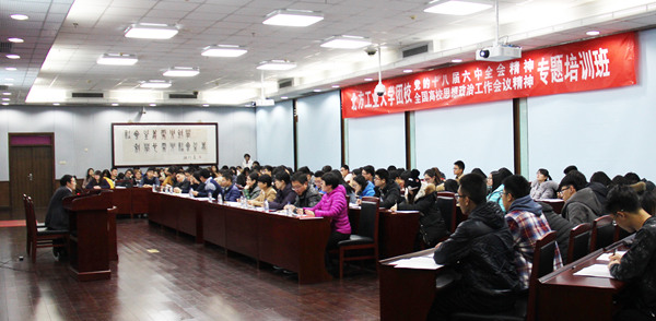 12月14日晚,校团委在浩学楼15层报告厅举办了2016年秋季学期团学骨干培训班。本次培训班专题就学习党的十八届六中全会精神、全国高校思想政治工作会议精神、高校共青团改革实施方案开展培训。校学生工作部部长高国伟、校团委书记何有华分别做了主题报告,校团委专职干部、各学院团总支书记以及各团学组织学生干部共计120余人参加了此次培训。