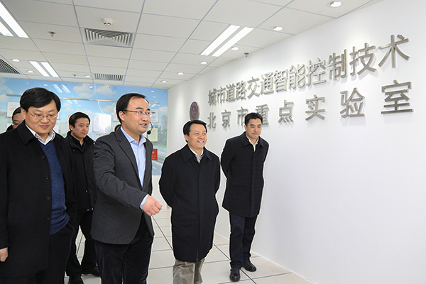 从学生公寓出来,振邦书记一行来到城市道路交通智能控制技术北京市重点实验室,听取了实验室的情况介绍,并亲切慰问正在进行科研实验的同学们。振邦书记对同学们在寒假期间能够留校继续科学研究表示赞赏,希望大家能够在科研道路上越走越高,取得更大的成绩。