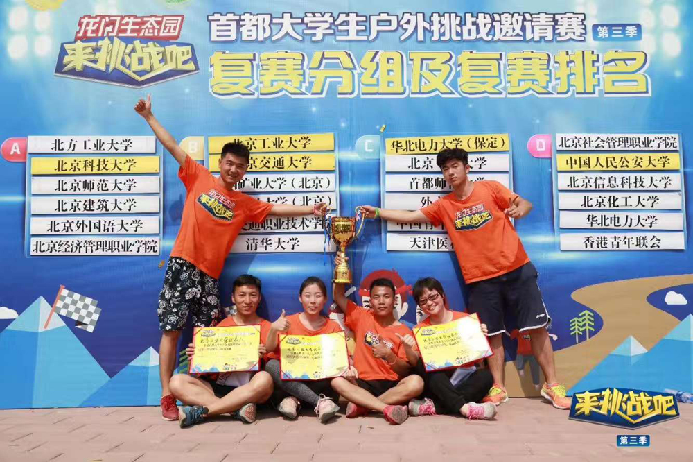 “来挑战吧”首都大学生户外挑战邀请赛(第三季)是团市委举办的大学生“三走”系列活动主体赛事,共有来自清华大学、中国人民公安大学、香港青年联队等京津冀以及香港地区的24支大学生代表队参赛。整个比赛包括高校预选赛、营地小组晋级赛和总决赛三个阶段,采用团体循环赛制,各代表队完成了原始技术、极速前进、紧急救援、团队协作等挑战项目。由来自建筑与艺术学院的徐东胜、邢家祥、马鑫、邱彪,和电子信息工程学院段凯强等5位同学组成的我校代表队凭借坚强的意志、过人的智慧、惊人的速度、拼搏的精神,最终战败了实力强大的公安大学代表队,一举夺取了总决赛的冠军。