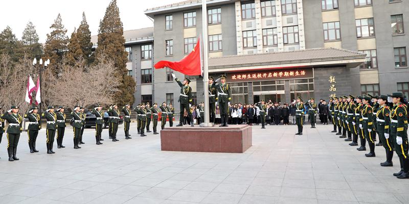 国旗班队员迈着整齐矫健的步伐,护送鲜艳的五星红旗走向升旗台。庄严的国歌响起,全体师生行注目礼,五星红旗在敦品楼前冉冉升起,激励着师生们将心中的爱国激情转化成新学期开启新征程、迎接新挑战、实现新目标的强劲动力。