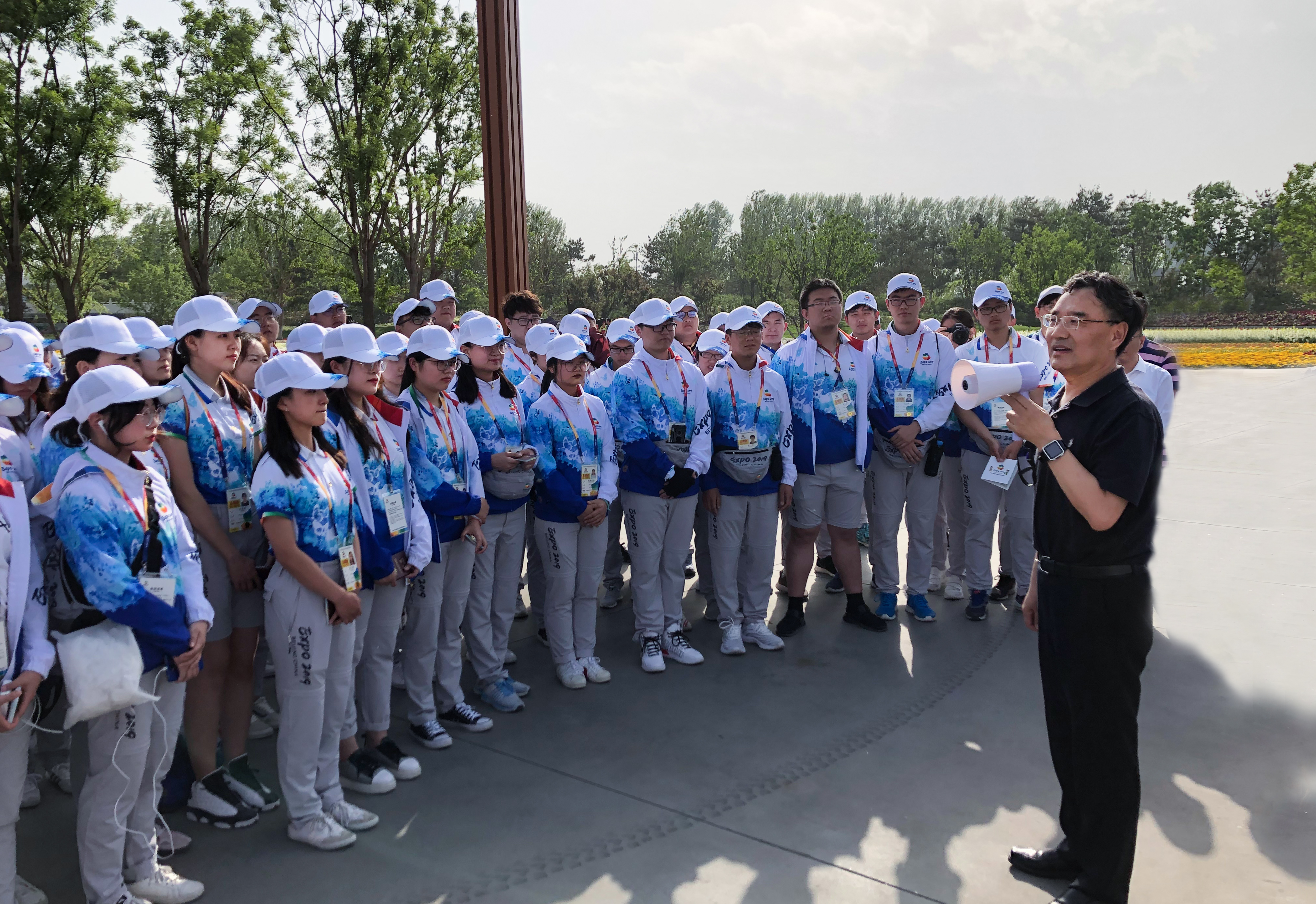 郑文堂书记在仔细询问了志愿者的工作和生活情况后,对大家为服务世园会所付出的努力和辛苦给予了充分肯定。在中国馆前,郑文堂书记深情地对志愿者们说,2019年中国北京世界园艺博览会是由中国政府主办、北京市承办的最高级别的世界园艺博览会,是中国向世界展示中华人民共和国成立七十年来经济发展和生态文明建设巨大成就的重要窗口。我校学生志愿者们能以饱满的精神状态参加此次世园会的志愿服务工作,体现了我校学生的时代责任与担当,展示了首都大学生的青春风采。虽然我校学生只在这里承担八天的志愿服务工作,但也是志愿服务的接力棒,为世园会贡献出了巨大力量。希望同学们在服务世园会的过程中一定要注意作息,劳逸结合,并把这些良好的、绿色的生活习惯带回学校。